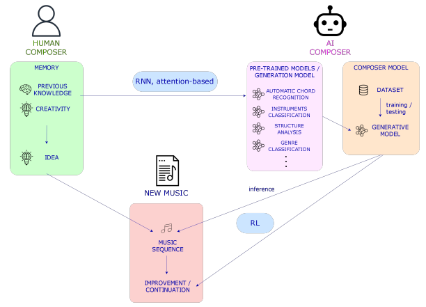 【图2:人工智能和人类创作过程的比较。在右边,人类作曲家利用他或她之前所拥有的知识创作音乐,也利用产生音乐思想的创造力,这些音乐思想可以是节奏、音符等,也可以是它们在主题或旋律中的组合。在左边,人工智能作曲家用在不同MIR任务上训练的模型(“先前的知识”)与在条件下创作音乐的模型相结合来创作音乐。未来,代表人工智能作曲家先前知识的预先训练的模型可能会被理解音乐的通才模型所取代,并且记忆可以与大型RNN相媲美。下面,我们看到了由人类或人工智能作曲家创作或完成的音乐片段(或“世界”,如果我们考虑所有现有的音乐),在后者的情况下,使用强化学习技术、序列模型等。】